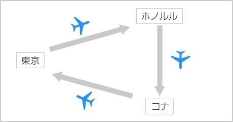 日本(東京・大阪・名古屋)→ホノルル→コナ→日本*の周遊運賃で、おトクにオアフ島とハワイ島の2島をお楽しみいただけます。 * 下図が旅程例。逆回り(日本→コナ→ホノルル→日本)は不可。 オアフ島でワイキキビーチやショッピングを楽しんだあとに、ハワイ島で大自然に癒される旅はいかがですか。