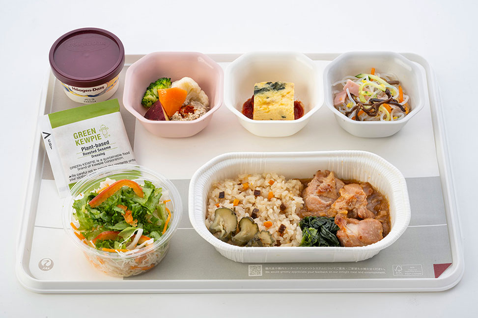 おいしいにこだわった機内食。JALの機内食を通して旅の楽しみを再認識していただきたいという想いのもと、新時代の才能を発掘する料理人コンペティションで優秀な成績を収めた若手シェフたちの十八番メニューが順次登場します。JALの推しシェフが作る、うま味*に注目した特別なメニューをお楽しみください。
